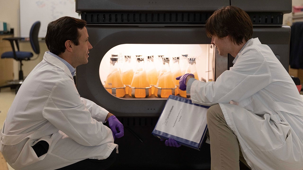 LambdaVision CSO Jordan Greco and Lead Engineer Daniel Sylva checking on shaker flasks containing a super-saline solution to grow bacteriorhodopsin.