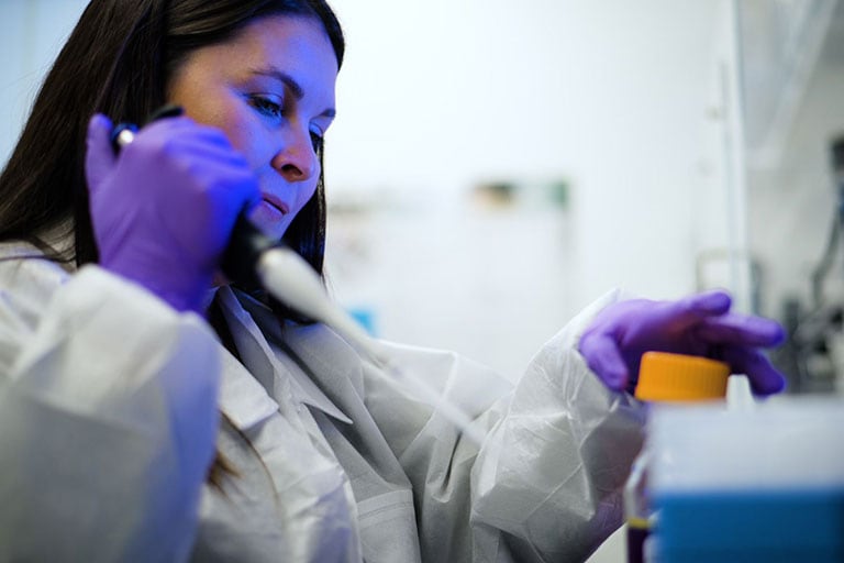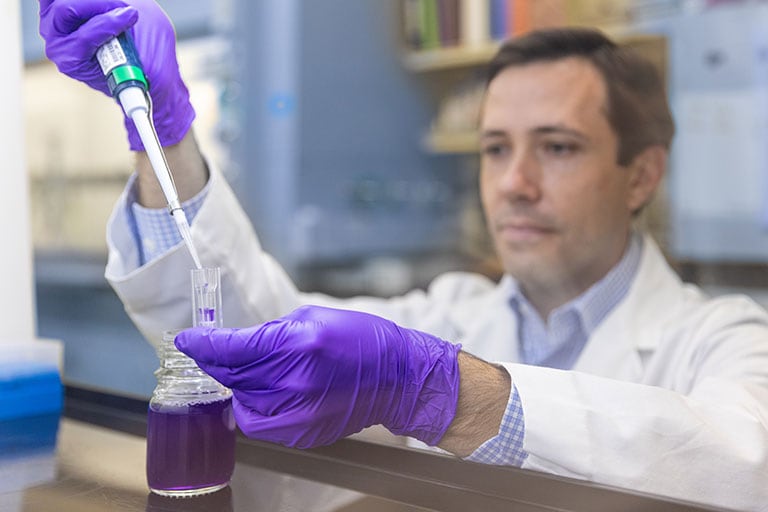 LambdaVision CSO Jordan Greco pipetting bacteriorhodopsin, the light-activated protein used in the company’s artificial retinas.